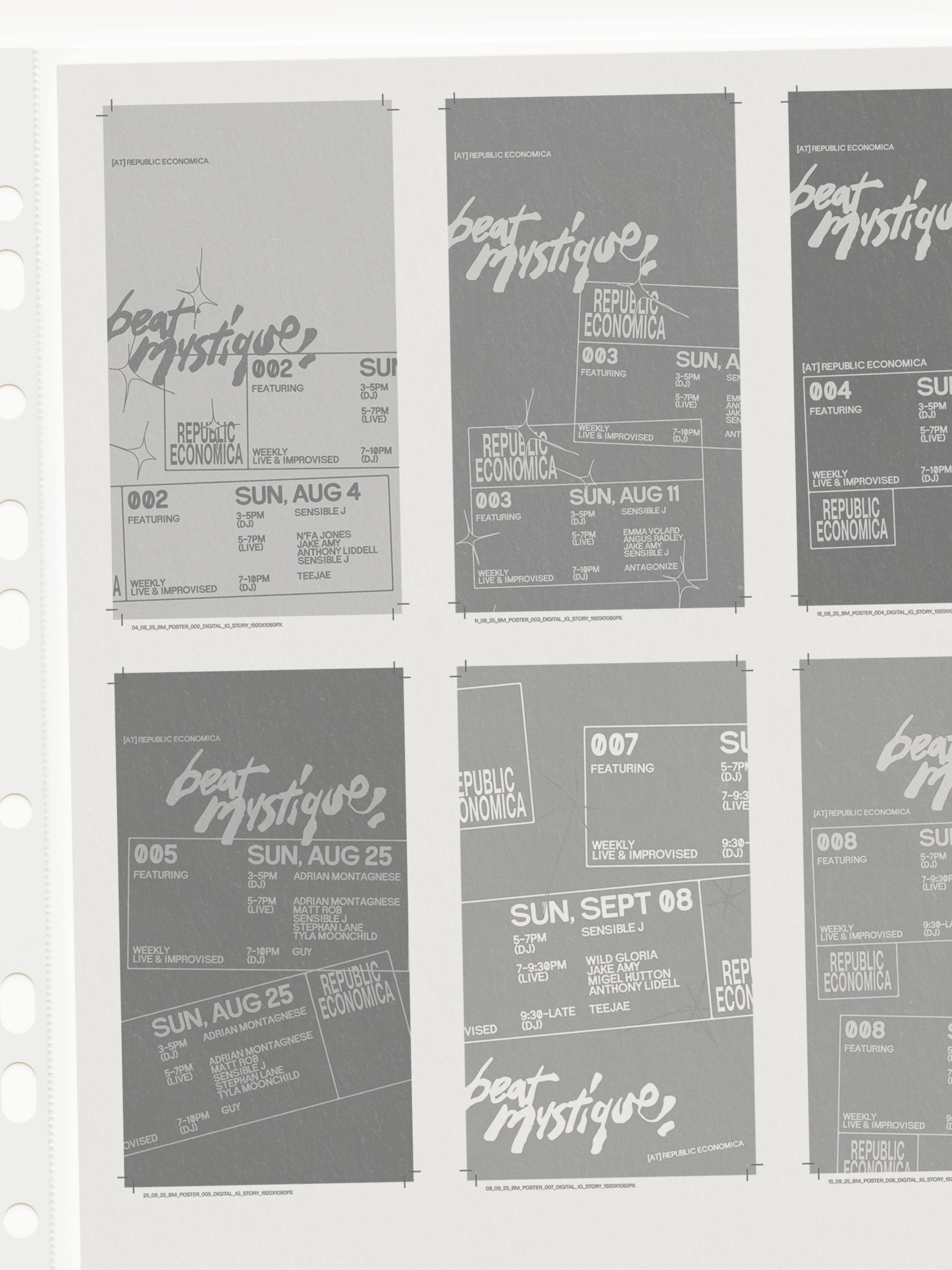 A live jazz and slow jams event brand. Inspired by nightclub stamps and the dynamism of improvisational jazz, this logo and poster system play on the chaos of in-the-round performances observed from close quarters.